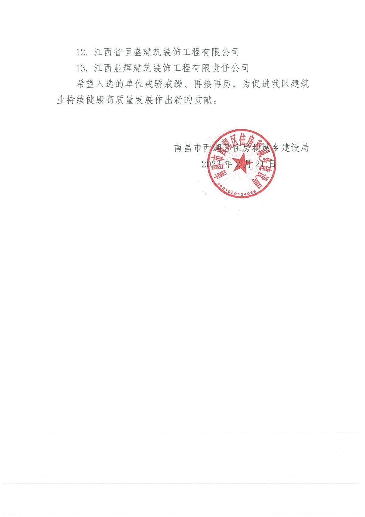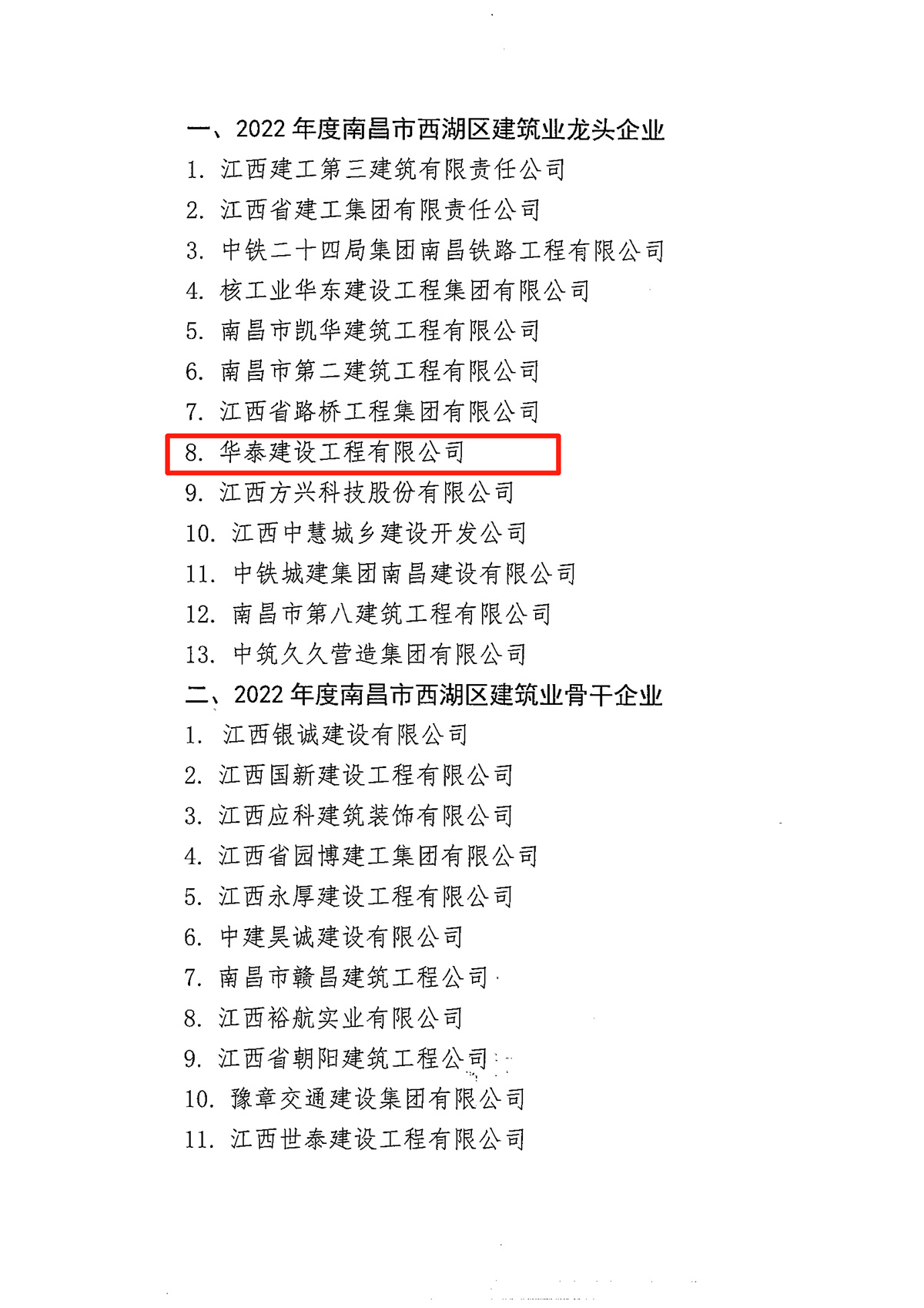 2023年2月21日,恰逢农历二月二龙抬头,在这个红红火火的日子,南昌市西湖区住房和城乡建设局发布了《关于公布2022年度南昌市西湖区建筑业龙头企业、骨干企业名单的通报》,经层层严格考评认定,易游·体育(中国)官方网站,YIYOU SPORTS凭借实干笃行与卓越品质获得“2022年度南昌市西湖区建筑业龙头企业”荣誉称号!这是继2023年1月获得“2022年度南昌市建筑业骨干企业”后的又一个荣誉认证。这不仅是对华泰建设的嘉奖与再次肯定,更是对华泰建设发展的激励与鞭策。